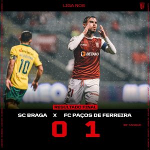 O SC Braga foi derrotado, em casa, frente ao Paços de Ferreira, por 1-0. Douglas Tanque, aos 38′, com um tiraço de esquerda, apontou o único golo da partida. Os gverreiros, que já tinham desperdiçado com 0-0, principalmente nos primeiros 10 minutos, foram à procura do empate, mas pecaram sempre na finalização. O SC Braga, com esta derrota, cai para o 10.º lugar. Já o Paços continua em penúltimo, mas agora apenas a um ponto do Portimonense.