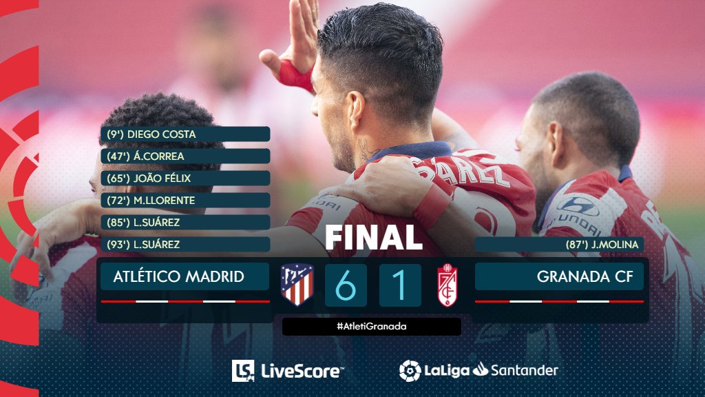 O Atlético recebeu e goleou o Granada, por 6-1, no primeiro jogo para a La Liga 2020-21. João Félix, que foi eleito o MVP, esteve em destaque com um golo e uma assistência. Quanto ao jogo, Diego Costa abriu o activo aos 9′, pouco depois Félix sofreu um penálti mas Rui Silva defendeu o remate de Saúl. No arranque da 2.ª parte apareceu mesmo o 2-0, com Félix a assistir Correa. Pouco depois foi o próprio português a fazer o 3-0 numa bela finalização. Logo a seguir Simeone promoveu várias alterações, e estreou Suárez, sendo que o uruguaio teve impacto imediato ao assistir Llorente para o 4-0. Já perto do fim foi o próprio Luis Suárez a juntar o seu nome aos marcadores. O Granada ainda reduziu por Molina, mas no último minuto de descontos Suárez bisou e fez o 6-1 final.