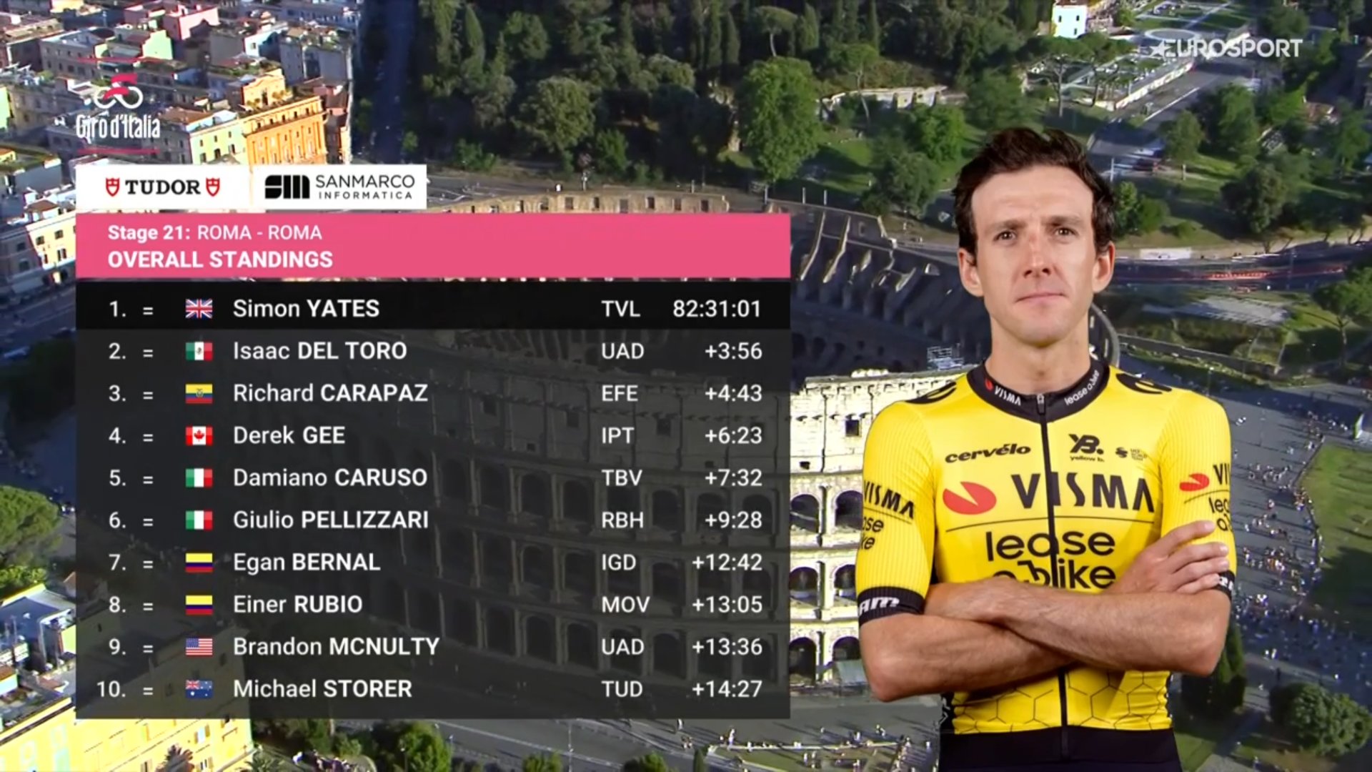 Simon Yates sagrou-se campeão do Giro. O ciclista britânico arrebata assim a 2.ª Grande Volta na carreira depois de ter conquistado a Vuelta em 2018. Num dia em grande para a Team Visma | Lease a Bike, Olav Kooij levou a melhor na etapa final ao bater Kaden Groves no sprint.