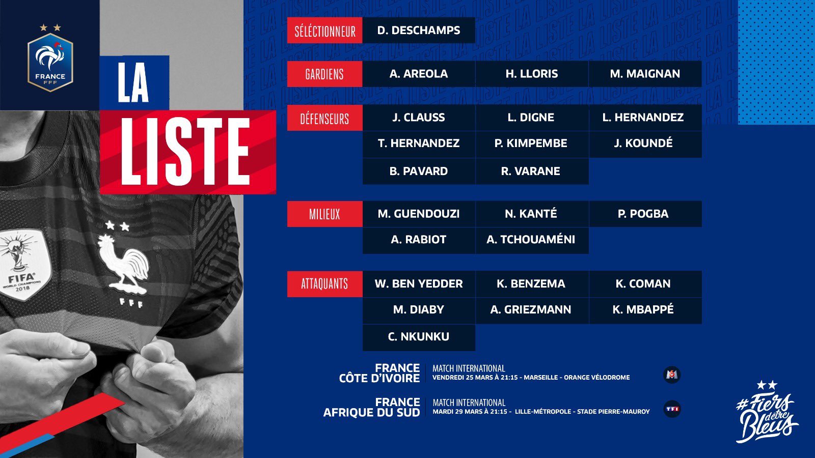 As estreias de Christopher Nkunku, que soma 26 golos e 15 assistências esta época e tem sido um dos jogadores em melhor forma na Europa, e Jonathan Clauss, lateral direito muito ofensivo do Lens (tem 4 golos e 9 assistências), são os principais destaques na convocatória de Deschamps para os particulares da França com a Costa do Marfim e África do Sul. Já Mattéo Guendouzi está de regresso, enquanto Giroud, Ousmane Dembélé, Fékir, Upamecano, Camavinga, Dubois, Zouma, Veretout, Gouiri, Caqueret ou Boubacar Kamara ficaram de fora. A convocatória dos campeões do Mundo: Guarda-redes: Alphonse Areola (West Ham), Hugo Lloris (Tottenham), Mike Maignan (AC Milan); Defesas: Jonathan Clauss (RC Lens), Lucas Digne (Aston Villa), Lucas Hernandez (Bayern), Théo Hernandez (AC Milan), Presnel Kimpembe (PSG), Jules Koundé (Sevilla), Benjamin Pavard (Bayern), Raphaël Varane (Manchester United). Médios: Matteo Guendouzi (OM), N’Golo Kante (Chelsea), Paul Pogba (Manchester United), Adrien Rabiot (Juventus), Aurélien Tchouameni (AS Monaco); Avançados: Wissam Ben Yedder (AS Monaco), Karim Benzema (Real Madrid), Kingsley Coman (Bayern), Moussa Diaby (Bayer Leverkusen), Antoine Griezmann (Atlético), Kylian Mbappé (PSG), Christopher Nkunku (RB Leipzig).