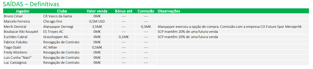 Em comunicado enviado à Comissão do Mercado de Valores Mobiliários (CMVM), a SAD do Sporting esmiuçou os movimentos no mercado de Inverno. No que respeita às saídas, os leões libertaram Luc Castaignos, Nani, Fredy Montero, Bruno César, Kiki Kouyaté, Euclides Cabral e Fokobo e dos encaixes financeiros com Marcelo (meio milhão de dólares, cerca de 440 mil euros), Merih Demiral (3,5 ME) e Tiago Djaló (0,5 ME).