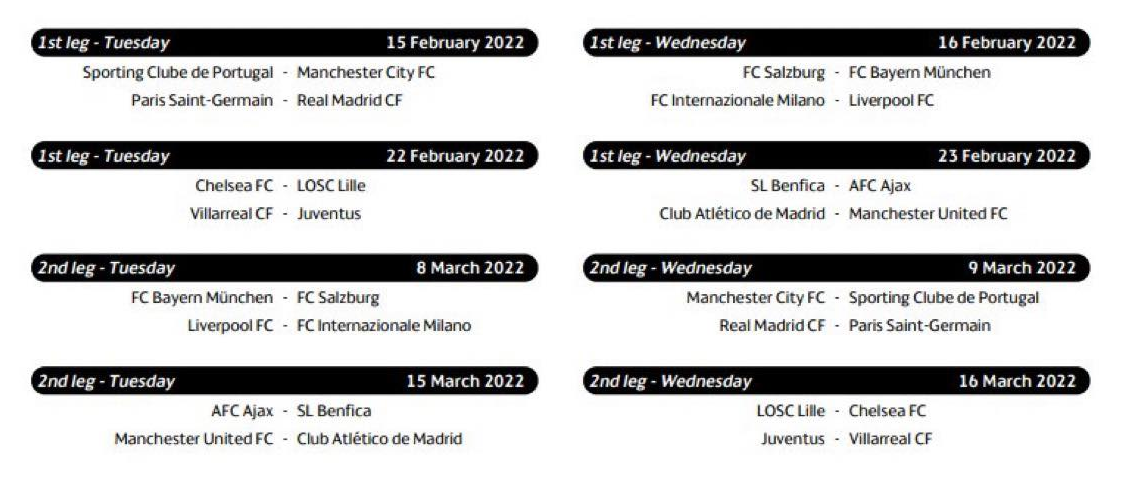 Já saiu o calendário dos oitavos-de-final da Champions. O Sporting vai jogar a 15 de Fevereiro contra o City, ou seja, três dias depois de ir ao Dragão jogar com o FC Porto. A 2.ª mão, por sua vez, está marcada para 9 de Março. Já o Benfica tem o primeiro jogo com o Ajax a 23 de Fevereiro, depois de ir ao Bessa defrontar o Boavista, e o 2.º a 15 de Março.