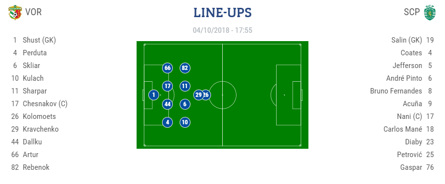 O Sporting vai começar na Ucrânia com: Salin, Bruno Gaspar, Jefferson, Coates, André Pinto, Petrovic, Acuña, Bruno Fernandes, Nani, Carlos Mané e Diaby. Já o Vorskla faz alinhar: Shust; Perduta, Dallku, Chesnakov, Artur; Kulach, Skliar, Sharpar, Rebenok; Kravhcenko; Kolomoets.
