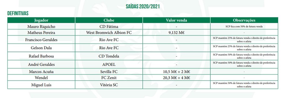 O Sporting revelou os detalhes de todas saídas neste Defeso, com destaque para as vendas de Matheus Pereira (9,132 ME), Wendel (20, 3 ME) e Acuña (10,5 ME), que permitiram um encaixe de 39,93 milhões de euros, fora os bónus. A equipa leonina esclareceu ainda que ficou com 25% de uma futura venda de Gelson Dala e Geraldes, que saíram para o Rio Ave, além do direito de preferência pelos dois jogadores. Já sobre Rafael Barbosa (Tondela) e André Geraldes (APOEL) o clube de Alvalade fica com 50% de uma futura venda e o direito de preferência.