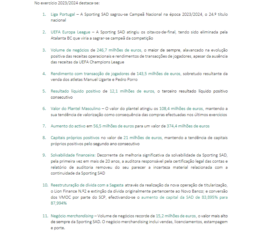 A Sporting SAD fechou a época 2023/2024 com um resultado líquido de 12,1 milhões de euros. Trata-se, assim, de um resultado histórico, pois foi a primeira vez em que os leões apresentaram contas positivas em três exercícios consecutivos.