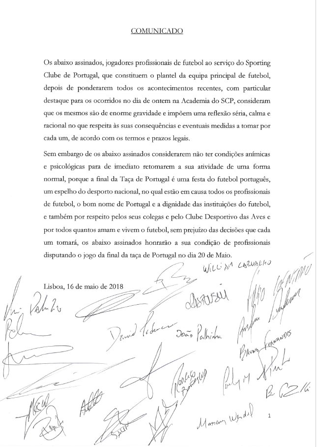 Os jogadores do Sporting comunicaram que irão alinhar na final da taça de Portugal, marcada para dia 20 de Maio contra o Desportivo das Aves. Numa mensagem assinada por todo o plantel após a reunião com o Sindicato dos Jogadores, os atletas entendem não ter condições anímicas para retomar a actividade de forma normal, mas por se tratar da final da taça, da imagem de Portugal e da dignidade das instituições do futebol e por respeito ao Aves, estarão presentes no Jamor.