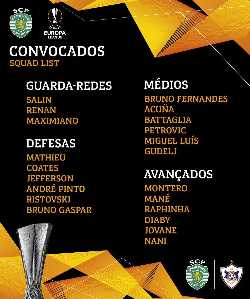 A presença de Miguel Luís, médio que venceu o Europeu sub-19 por Portugal, é a principal novidade na lista de convocados do Sporting para o encontro com o Qarabag, relativo à 1.ª jornada da Liga Europa. Também Nani e Mathieu integram a lista, já Viviano, Wendel e Bas Dost ficaram de fora.