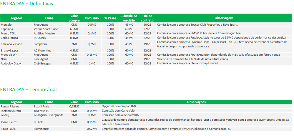 O Sporting revelou todos os negócios que fez no último Defeso num documento enviado à CMVM. Nas aquisições, Raphinha foi o reforço mais caro, tendo sido contratado ao Vitória por 6,5 ME. Logo a seguir vem Diaby, que custou 4,5 milhões, mais um milhão de comissão, e Bruno Gaspar, que obrigou a um investimento de 4,5 milhões. Viviano custou 2 ME mais 200 mil em comissão. Nani, por sua vez, não envolveu qualquer montante, tendo apenas o Valência ficado com direito a 40% do valor de uma futura venda. Destaque ainda para Carlos Jatobá, que foi um dos últimos reforços da dupla Inácio-Bruno de Carvalho, que custou 100 mil euros, mas que poderá obrigar a um investimento de 1,5 ME em comissão dependendo da performance desportiva. Em relação aos elementos que chegaram à Alvalade por empréstimo, Gudelj, que custou três milhões, foi o mais caro. Sturaro custou apenas 150 mil euros de comissão, enquanto Renan, emprestado pelo Estoril, custou, para já, 250 mil euros, havendo opção de compra prevista no milhão de euros. Nas saídas, destaque para transferência de Pedro Delgado para o Shandong Luneng, por 800 mil, e o 1,1 ME que os leões encaixaram com os empréstimos de Geraldes (200 mil), Jonathan (200 mil), Domingos Duarte (200 mil) e Matheus Pereira (500 mil).