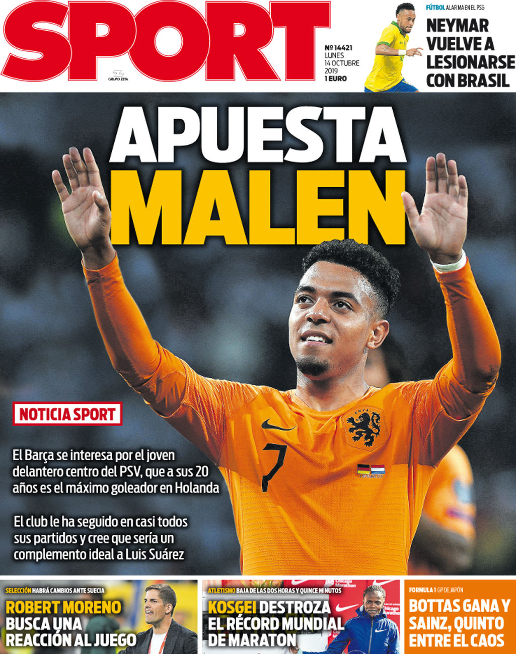 O jornal ‘Sport’ dá hoje grande destaque ao interesse do Barcelona em Donyell Malen, do PSV. O jovem avançado, internacional holandês, de 20 anos, é o actual melhor marcador da Eredivisie, e ao todo leva 16 golos em 17 jogos esta época. A publicação acrescenta que os catalães há muito estão no mercado por uma alternativa a Suárez, e recordam que o campeão espanhol no último Defeso falhou a contratação de Luka Jovic.