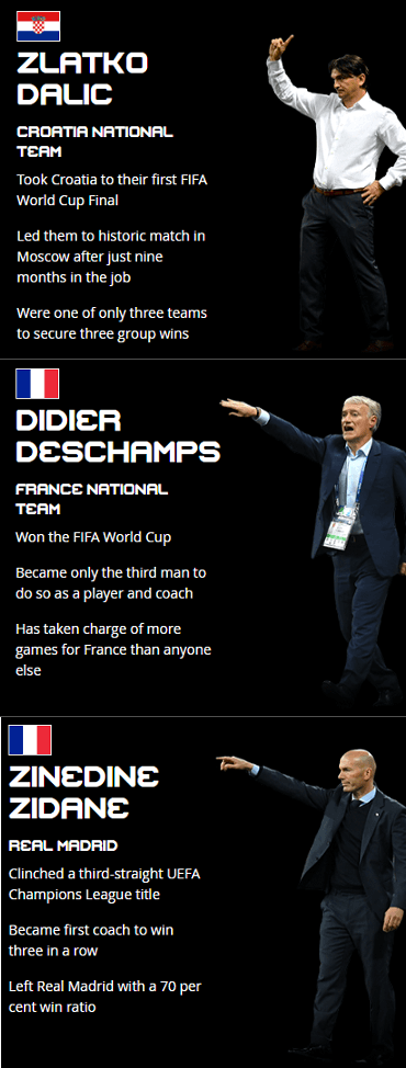 Zlatko Dalić, seleccionador da Croácia, Didier Deschamps, seleccionador da França, e Zinédine Zidane, que orientou o Real Madrid até Junho, são os candidatos a receber o The Best para Melhor Treinador do Ano da FIFA. A decisão vai ser conhecida no dia 24 de setembro, em Londres.