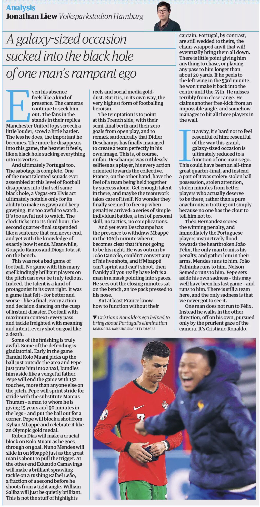 A imprensa internacional não poupou Ronaldo depois da eliminação de Portugal no Euro’2024 e Jonathan Liew, no The Guardian”, foi bastante assertivo sobre o capitão da seleção nacional. «Até a sua ausência parece uma espécie de presença. As câmaras continuam a procurá-lo. Os adeptos nas bancadas, com as suas réplicas de camisolas do Manchester United, gritam um pouco mais alto e franzem a testa com um pouco mais de força. Quanto menos ele faz, mais importante ele se torna. Quanto mais ele desaparece neste jogo, mais pesado parece, como um buraco negro a sugar tudo para seu vórtice. E finalmente Portugal também. A sabotagem está completa. Uma das equipas mais talentosas já reunidas neste nível de futebol desaparece naquele mesmo buraco negro. Um ato de Elvis da era de Las Vegas, em última análise, notável apenas pela sua capacidade de nos fazer ficar boquiabertos e continuar boquiabertos (…) Entretanto, Gonçalo Ramos e Diogo Jota estão sentados no banco. (…) Theo Hernández marca o penálti da vitória e imediatamente os jogadores portugueses correm em direção ao desolado João Félix, o único homem a falhar o penálti, e abraçam-no. [Nuno] Mendes corre na direção dele, João Palhinha corre na direção dele, Nélson Semedo corre na direção dele. Pepe deixa de lado a sua própria tristeza — este pode muito bem ter sido seu último jogo — e corre para ele. Ainda há uma equipa aqui e a única tristeza é que nunca conseguimos vê-la. Um homem não corre para Félix. Em vez disso, ele caminha na outra direção, sozinho, perseguido apenas pelo olhar lascivo da câmara. É Cristiano Ronaldo.»