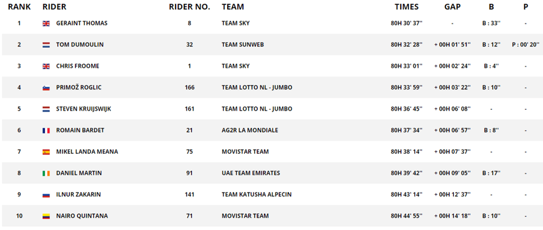 Não era o principal favorito, mas a vitória não é surpreendente. Thomas, que tinha como melhor resultado em três semanas um 15.º lugar, já tinha demonstrado anteriormente que tinha capacidade para vencer uma grande Volta, mas por ter de trabalhar para Froome ou quedas (como no Giro) nunca teve essa oportunidade, ainda por cima este ano foi muito favorecido pelo contexto. Ficou logo com uma vantagem confortável no 1.º dia, estava motivado pela vitória no Critérium du Dauphiné, o que lhe deu mais força dentro da Sky, e o percurso e situação de corrida favoreceu-o: etapas ao seu estilo, os adversários ficaram cedo com segundos até minutos de atraso, e depois quando se tem esta Sky, fica muito complicado tirar a liderança aos britânicos. Já Dumoulin consegue novo 2.º lugar, tal como no Giro, e vence a etapa, ao passo que Froome consegue pelo menos o pódio, levando a melhor sobre Roglic.