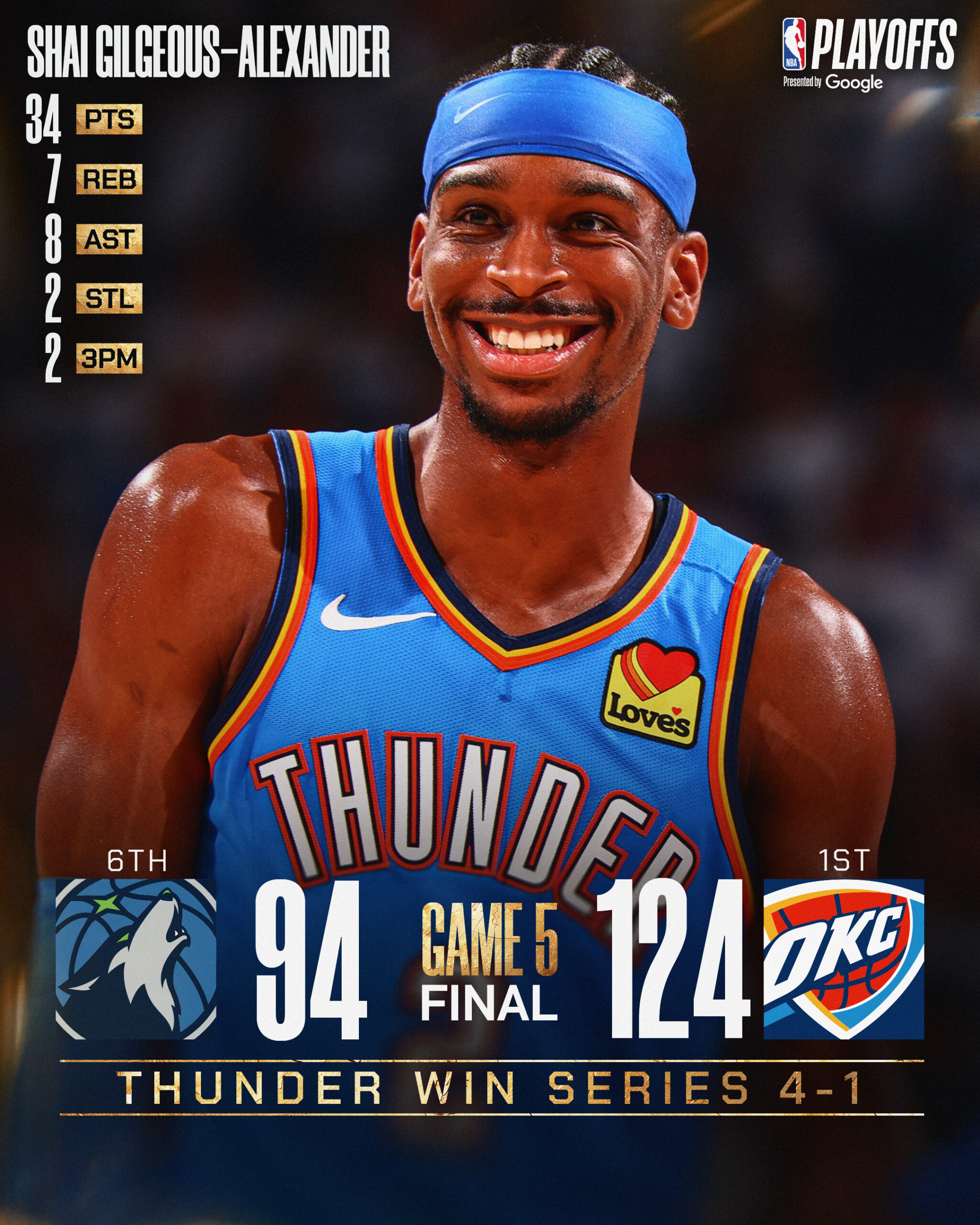 Os Thunder apuraram-se para a final da NBA ao arrasarem os Wolves no jogo 5 (124-94). OKC, que não estava na decisão desde 2012, no 1.º período já vencia por 17 e ao intervalo por 33. Shai Gilgeous-Alexander brilhou com 34 pontos, Chet Holmgren chegou aos 22 e Jalen Williams aos 19. Já na equipa de Minnesota, Edwards ficou pelos 20 e McDaniels só chegou aos 5.
