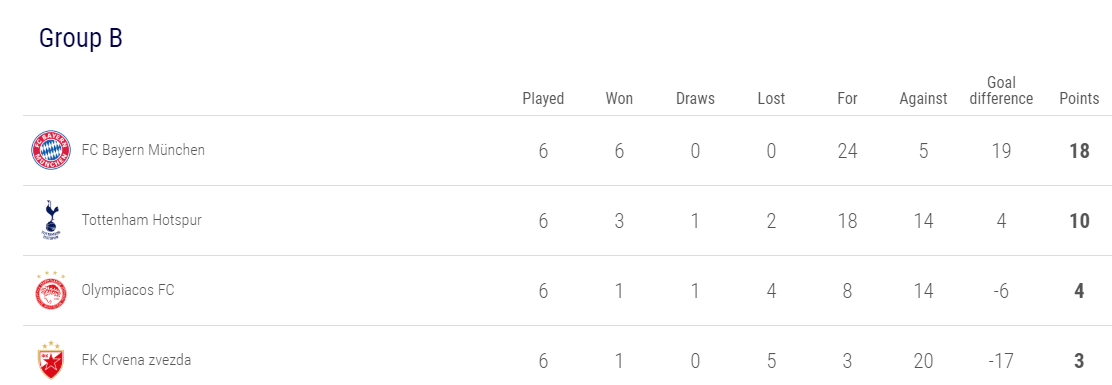 Na última jornada do grupo B, o Bayern fez o pleno ao derrotar, em casa, o Tottenham, por 3-1. Coman, que pouco depois saiu lesionado, abriu o activo, Sessegnon ainda empatou, mas Muller e Coutinho deram os 3 pontos aos bávaros. No outro jogo, o Olympiacos recebeu e bateu o Estrela Vermelha (1-0), conseguindo assim o 3.º lugar que dá acesso à Liga Europa. Tomané atirou um penálti ao ferro ainda com 0-0, e a 3 minutos do fim os sérvios pagaram a factura com El Arabi a dar a vitória ao conjunto de Pedro Martins numa penalidade cometida por Jander.