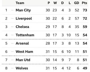 Além de estarem em desvantagem relativamente a arsenal e Tottenham ainda tem um calendário bem difícil com deslocações a arsenal, Everton e Liverpool, sendo que ainda recebem o Chelsea. Nao vejo qualquer hipótese de chegarem ao 4 lugar.