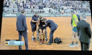Alexander Zverev lesionou-se com gravidade no muito físico embate contra Nadal, para as meias-finais de Roland Garros. O encontro, que já tinha mais de 3 horas de duração apesar de ainda ir só no final do 2.º set, teve imensas reviravoltas, o alemão inclusive esteve por cima nos 2 sets e com oportunidades para o vencer, e quando Rafa tentava levar o jogo para tie-break torceu o tornozelo, tendo, com um visível sofrimento, sido obrigado a deixar o court numa cadeira de rodas. Nadal segue assim para a final depois de ter vencido o 1.º set no tie-break, quando teve de anular vários set points, sendo que no 2.º também viu Zverev servir para fechar o set.