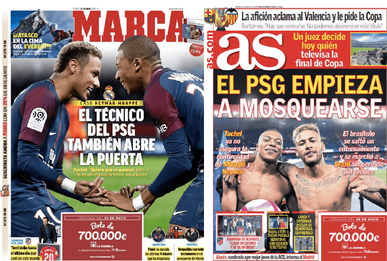 Neymar e Mbappé estão a ser todos os dias apontados ao Real Madrid e Thomas Tuchel, na antevisão da última jornada da Ligue 1, deu força a esses rumores, ao não garantir a continuidade das duas estrelas no PSG. «Isto é futebol! Não somos ingénuos. Muitos clubes querem transferir muitos jogadores e o mercado é louco. Mas sim, quero-os aqui na próxima época. Mas se não for assim, encontraremos soluções», disse, o alemão, que comentou ainda as palavras de Mbappé no passado domingo, que deixou em aberto a possibilidade de mudar de ares: «O Mbappé tem objetivos, é muito inteligente e quiçá terá pensado que era o momento de dizê-lo, mas está convidado, como todos os jogadores do PSG, a assumir responsabilidades. Não é necessário um discurso para dizer isso.»