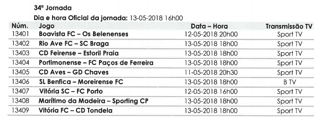 Já são conhecidos os horários da 34.ª e última jornada da I Liga. O encontro entre Aves e Chaves abre a ronda, no 11 de maio, às 20h30. O Vitória SC-FC Porto joga-se no sábado, dia 12 de maio, às 16h00. Às 20 horas do mesmo dia, é a vez de Boavista FC e Os Belenenses entrarem em campo. “As restantes partidas, a saber, Rio Ave FC-SC Braga, CD Feirense-Estoril Praia, Portimonense-FC Paços de Ferreira, SL Benfica-Moreirense FC, Marítimo M.-Sporting CP e Vitória FC-CD Tondela, disputar-se-ão a 13 de maio, às 18 horas”, informou a Liga Portugal.