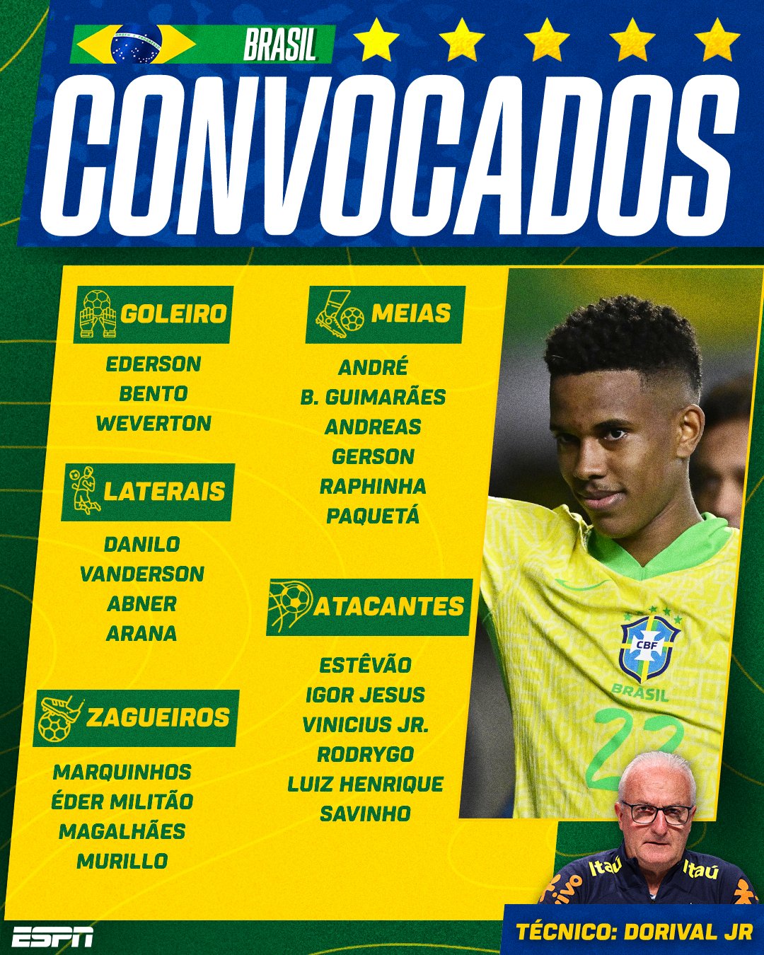 A estreia de Murillo, central do Nottingham Forest, é o grande destaque na convocatória do Brasil para os jogos com a Venezuela e Uruguai. Estevão, Militão e Vinícius, por sua vez, estão de volta. Já Endrick, do Real Madrid, ficou de fora das opções de Dorival.