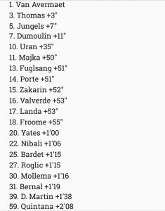Excelente vitória da BMC, qu mesmo sem Dennis consegue vencer. A Sky e a Scott recuperam tempo, ao passo que Movistar, Sunweb e Katusha fizeram um crono na linha do que imaginava. Quick Step bem a ficar no pódio, Drapac a defender-se bem, enquanto Jumbo foi a decepção. Destaque ainda para a AG2R, Astana e, sobretudo, Bahrain, que, apesar do tempo perdido, perderam menos do que eu esperava. Nibali está em excelente posição.