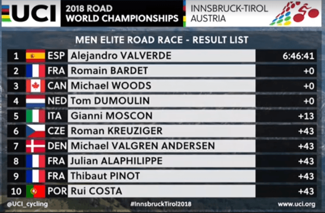 Parabéns também ao Bardet, que por pouco não ganhou. Está cada vez melhor nestes percursos. Woods leva o bronze e surpreende de certa forma também. Rui Costa top-10, nada mal para o que foi a sua época.