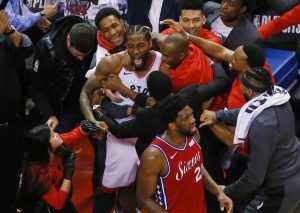 Toronto juntou-se a Milwaukee na final do Este da NBA depois de bater os 76ers, no jogo 7, por 92-90. O duelo foi muito equilibrado, nervoso, nem sempre bem jogado e acabou resolvido com um buzzer-beater de Leonard, que de maneira algo caricata (a bola bateu várias vezes no aro antes de entrar) eliminou Philadelphia. O ex-Spurs, (que lançou 39 vezes) terminou o jogo com 41 pontos, também Ibaka foi decisivo ao juntar 17 pontos a 8 ressaltos. Já do lado dos 76ers, Embiid terminou com 21 pontos e não conteve as lágrimas no final do jogo. Butler, por sua vez, apesar de ter aparecido no 4.º período, só chegou aos 16.