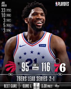 Os 76ers passaram para a frente na série (2-1) ao derrotarem, em casa, os Raptors, por 116-95. Philadelphia começou melhor, embalou no 2.º período (chegou a ter 15 pontos de vantagem) ainda viu Toronto aproximar-se no 3.º período mas no 4.º voltou a aumentar a vantagem. Joel Embiid brilhou com 33 pontos (máximo nos playoffs), 10 ressaltos, 5 blocos e 3 assistências, mas Butler (22 pontos, 9 ressaltos e 9 assistências) também fez a diferença. Já Redick contribuiu com 15 pontos, enquanto Ennis voltou a dar um bom contributo do banco (10 pontos e 5 ressaltos). Do lado de Toronto o inevitável Leonard chegou aos 33 pontos, Siakam terminou com 20, mas Lowry (7) e Gasol (7) voltaram a dar pouco.