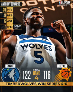 Os Wolves limparam a série ao baterem os Suns, por 122-116, no jogo 4. Booker até marcou 49 pontos e Durant 33, mas Edwards voltou a brilhar (40 pontos, 6 assistências e 9 ressaltos), tendo ainda tido uma boa ajuda de Towns (28 pontos e 10 ressaltos. Grande noite também para Pacers e Knicks, que bateram os Bucks e 76ers respetivamente. Já os Clippers foram a Dallas vencer por 116-111 e empataram assim a série.