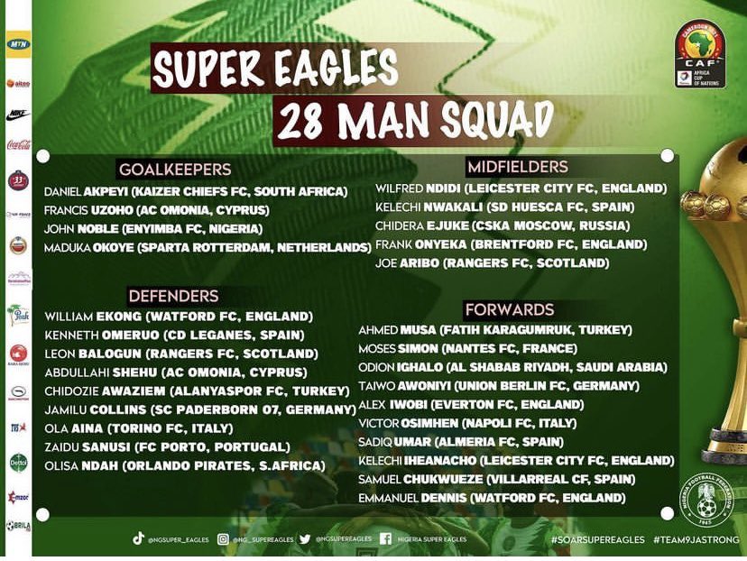 As super águias, que vão chegar à prova numa indefinição, devido à saída do agora ex-selecionador Gernot Rohr há duas semanas, contam com um ataque fortíssimo, principalmente se Osimhen estiver a 100%.